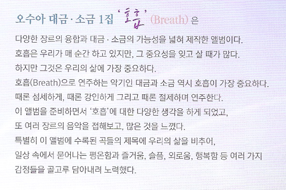 ¿À¼ö¾Æ ´ë±Ý ¼Ò±Ý 1Áý ¡®È£Èí¡¯(Breath)Àº ´Ù¾çÇÑ À帣ÀÇ À¶ÇÕ°ú ´ë±Ý, ¼Ò±ÝÀÇ °¡´É¼ºÀ» ³ÐÇô Á¦ÀÛÇÑ ¾Ù¹üÀÌ´Ù. È£ÈíÀº ¿ì¸®°¡ ¸Å ¼ø°£ Çϰí ÀÖÁö¸¸, ±× Á߿伺À» ÀØ°í »ì ¶§°¡ ¸¹´Ù. ÇÏÁö¸¸ ±×°ÍÀº ¿ì¸®ÀÇ »î¿¡ °¡Àå Áß¿äÇÏ´Ù.